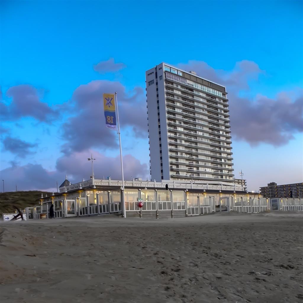 Op de foto zie je het hoge Palace Hotel Zandvoort; Strandpaviljoen Thalassa is aan de 'voet van het Palace Hotel'.